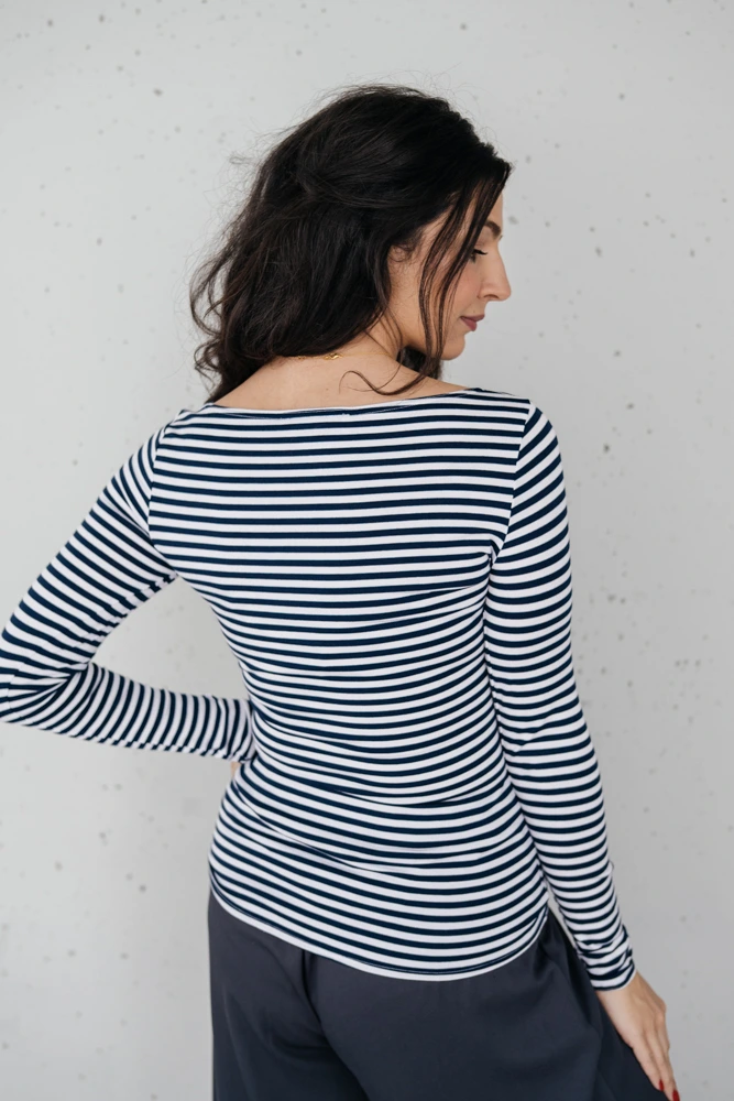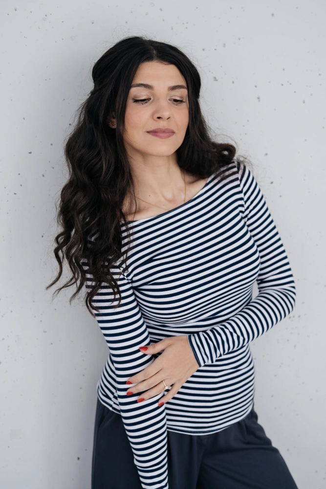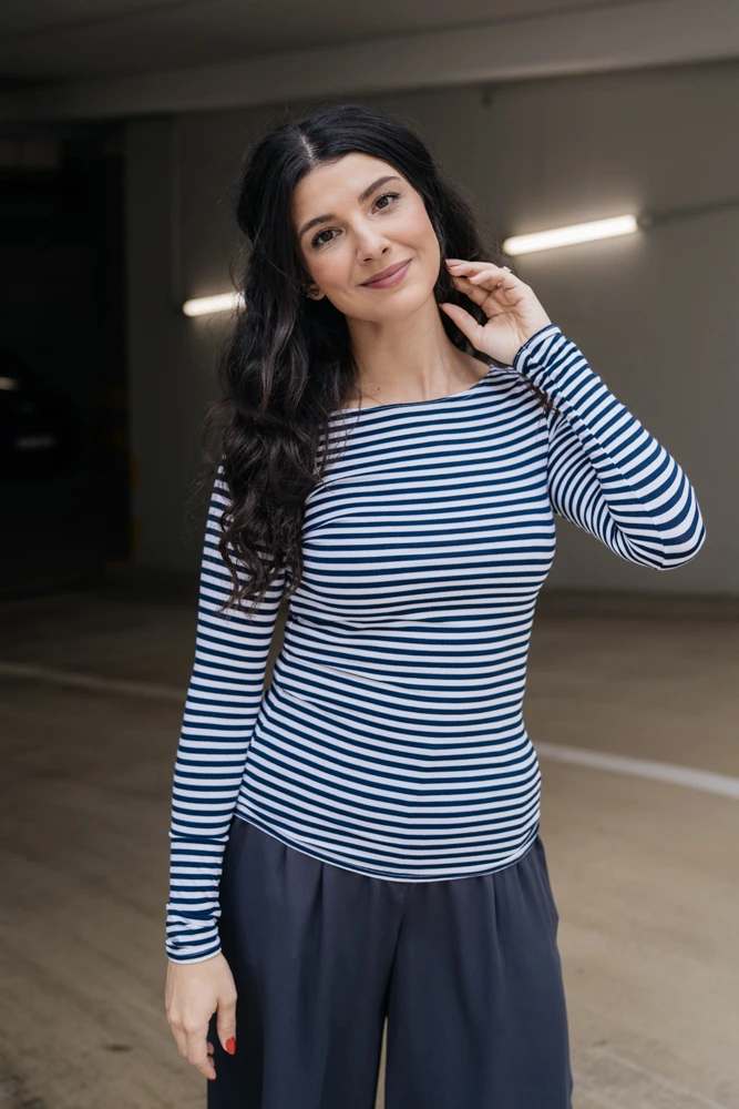 Bamboo tričko Amabile s dl. rukávem modro-bílý tenčí proužek – Reparáda