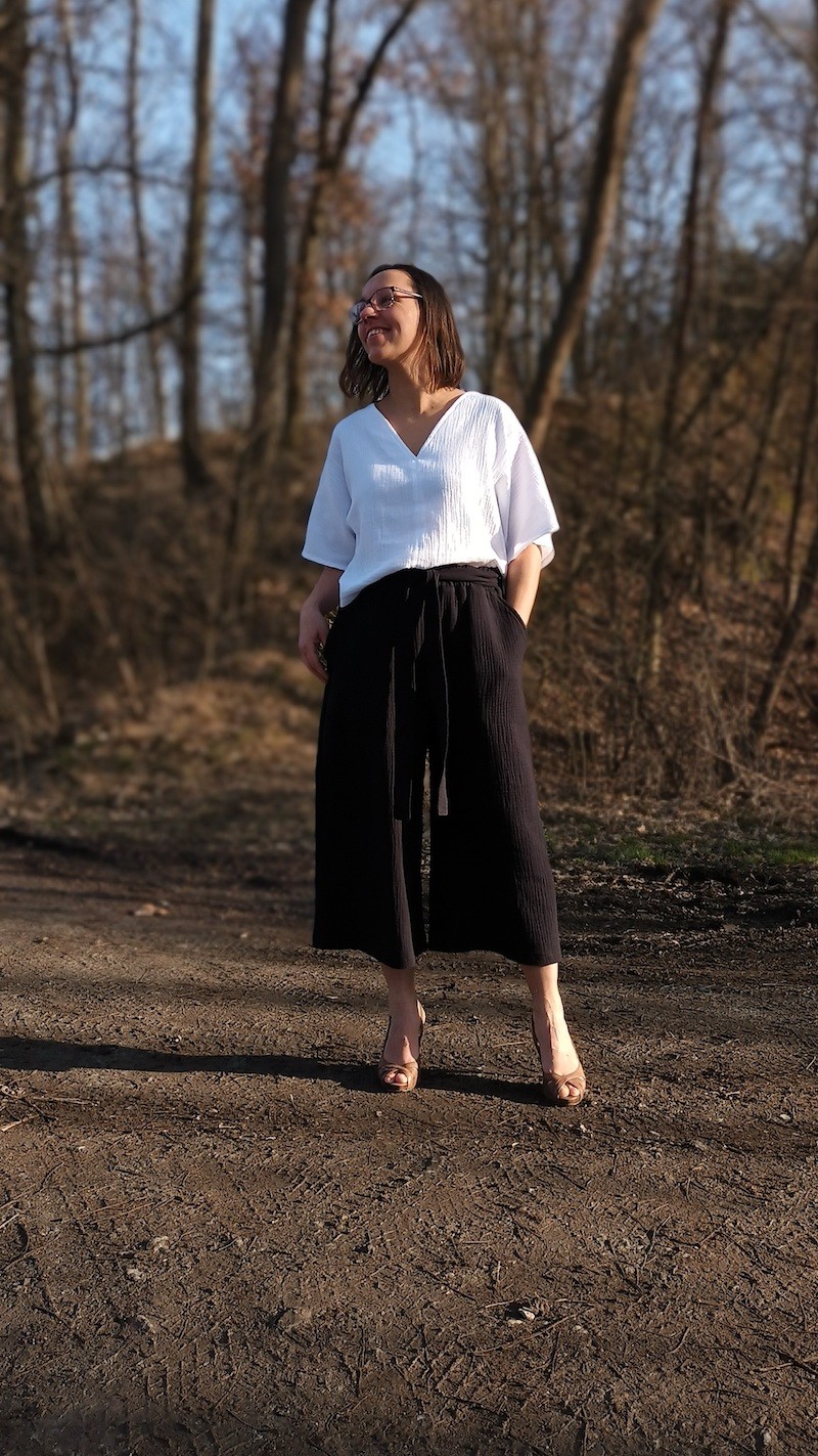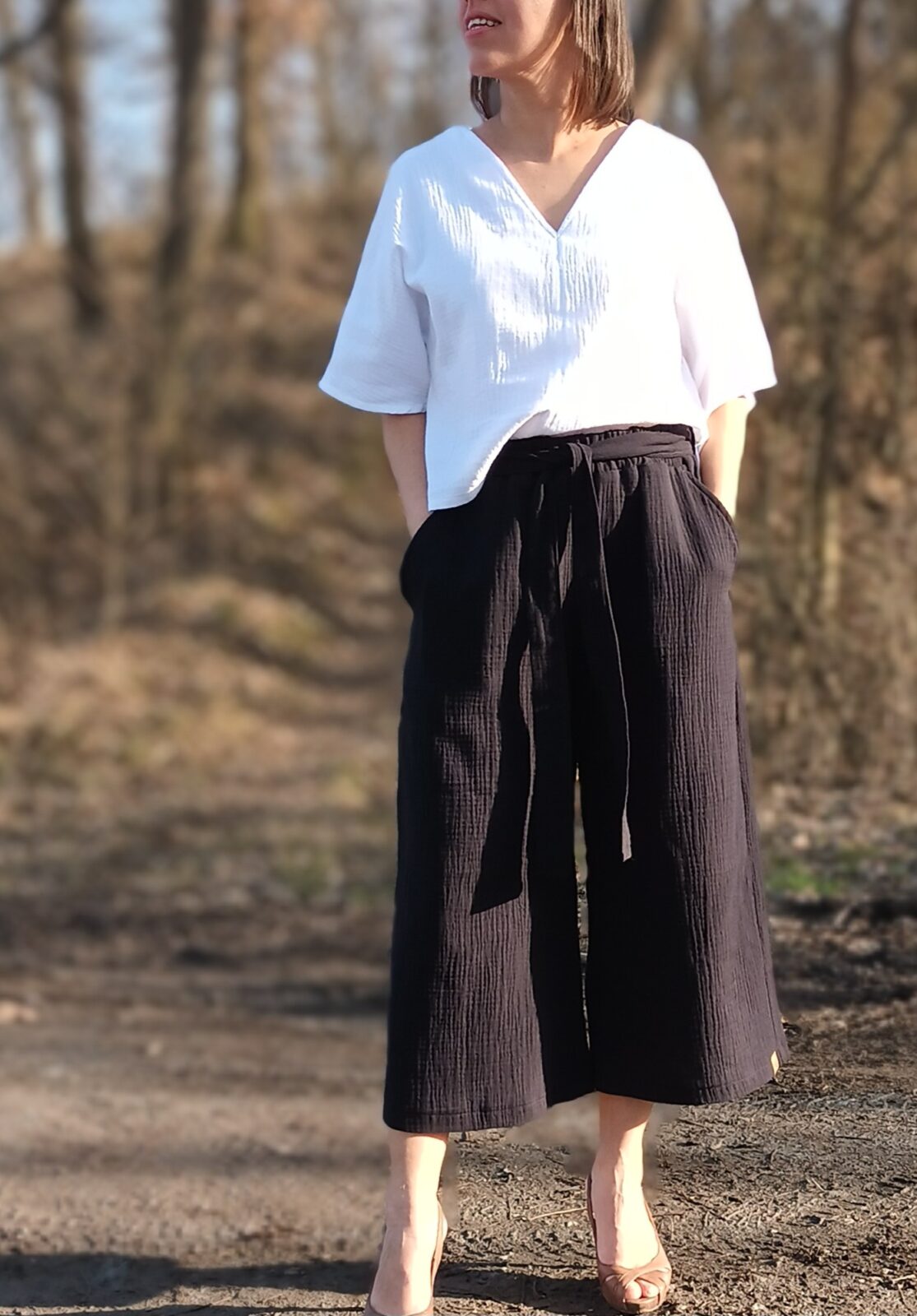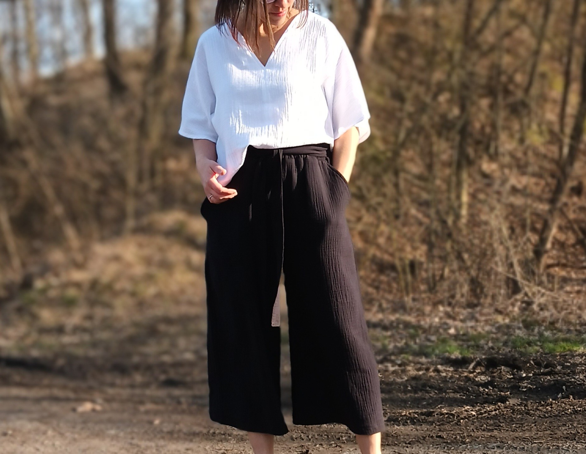 Příjemné splývavé culottes 7/8 délky z přírodního materiálu směsi viskózy a lnu.