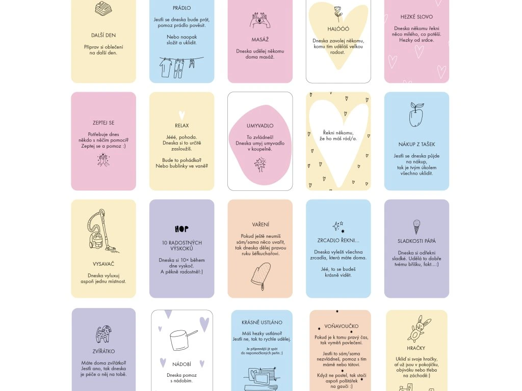 Prostě: •najděte si vhodný čas (ideálně ráno), •vylosujte si jednu kartu (společnou nebo každý svou), •splňte úkol (máte na to celý den)