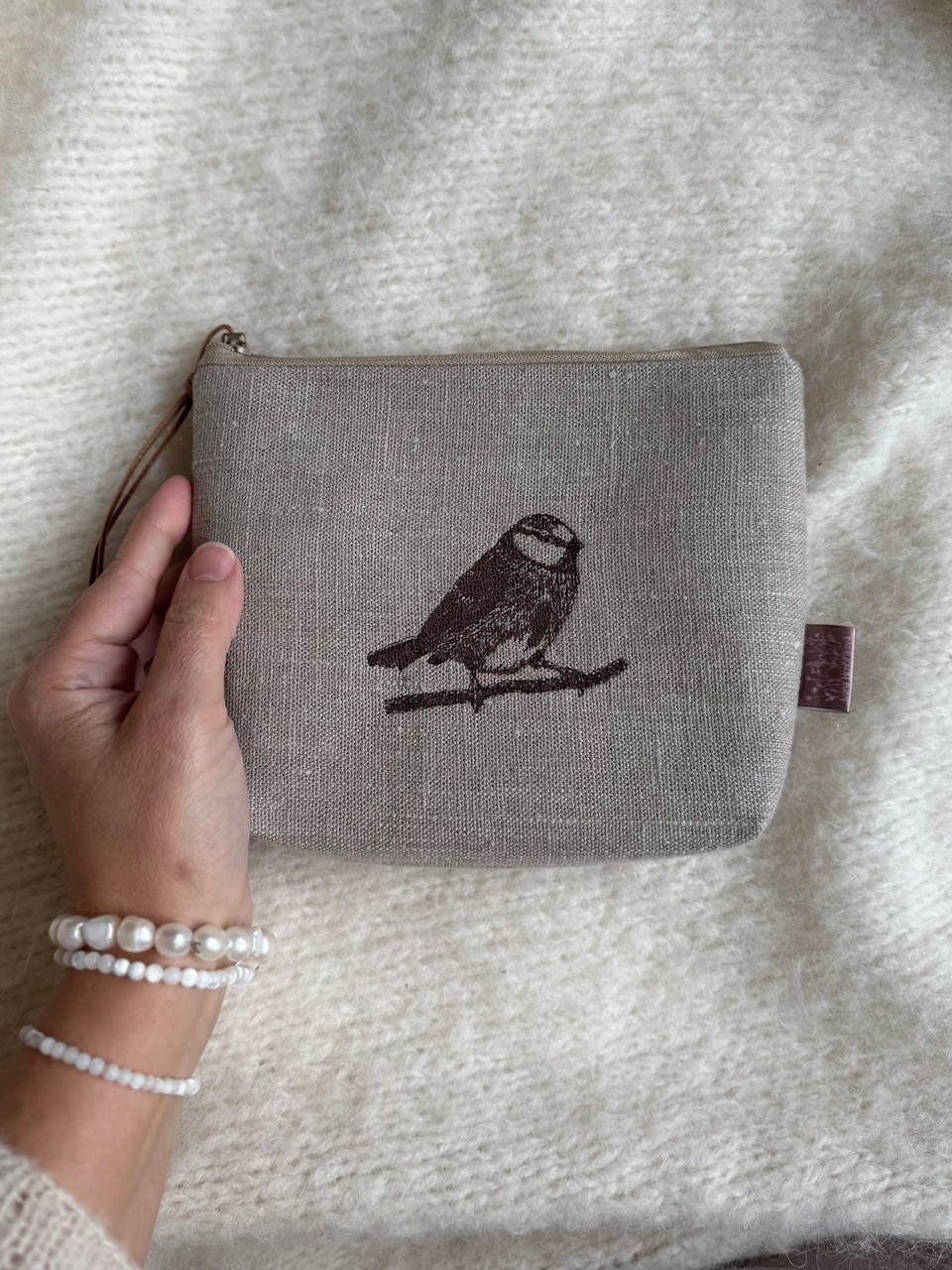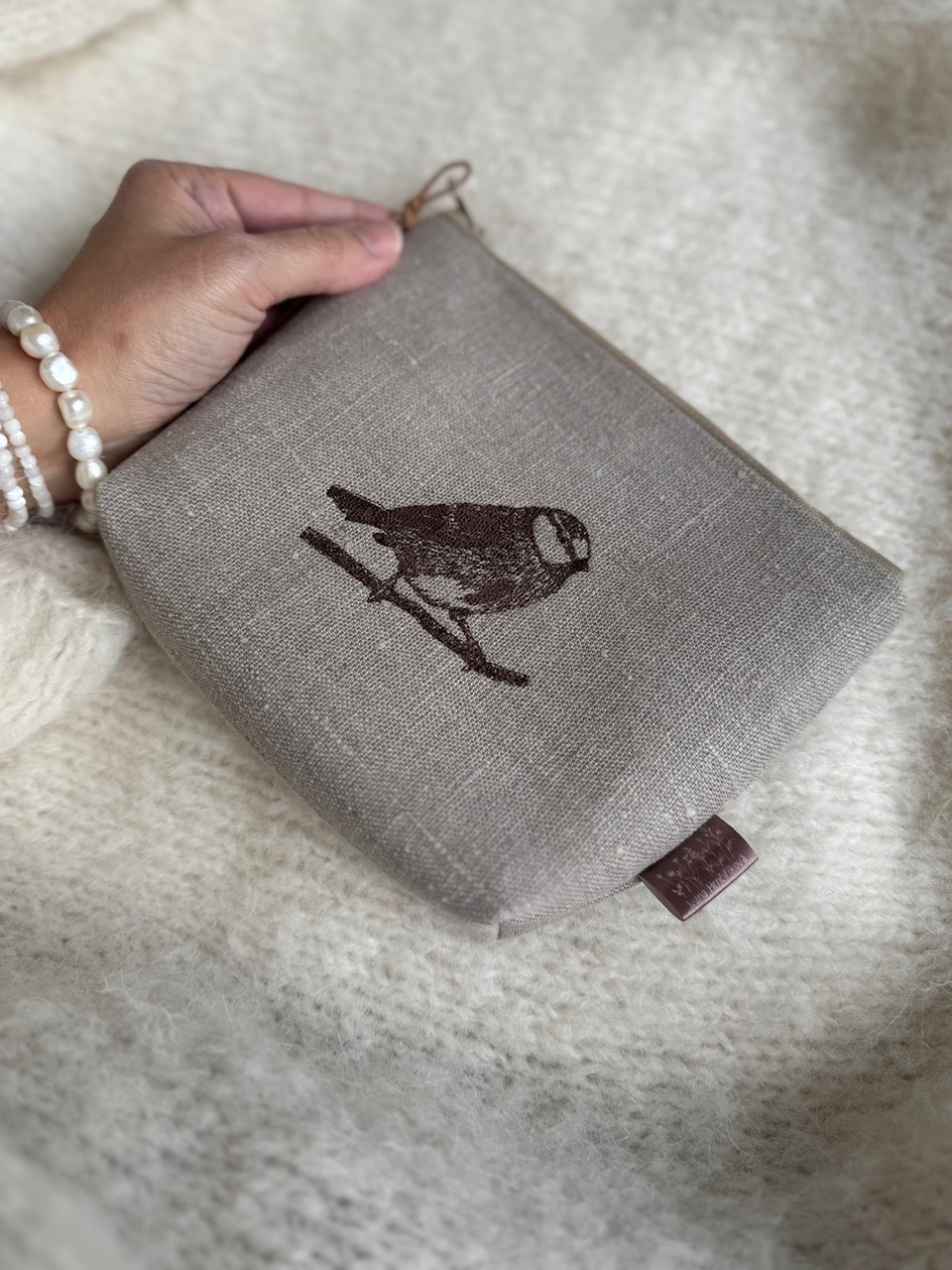 Lněné vyšívané pouzdro s ptáčkem a květinou – Ivana Hrnčiříková