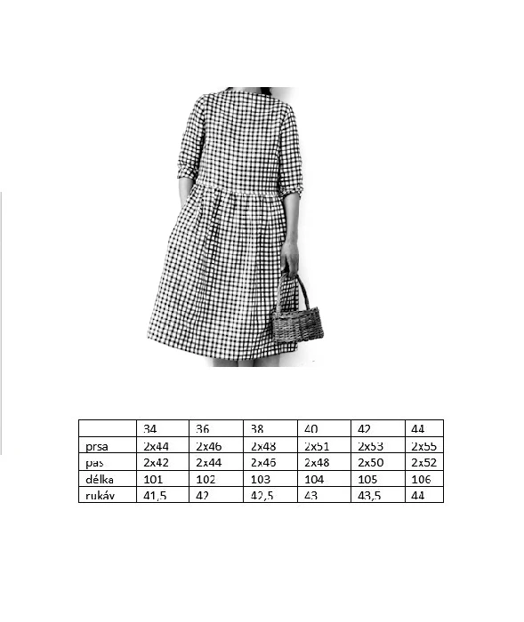 Mají rovný výstřih, 3/4 rukávy, kapsy skryté ve švech, pevný pas