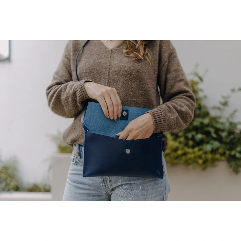 Kabelka Vega je vyrobena z přírodní třísločiněné kůže a je šitá ručně – pevným sedlářským stehem. Díky tomu a jejímu jednoduchému nadčasovému střihu jde o kousek, který vám s dobrou péčí vydrží dělat parádu řadu let. Je navržena tak, aby při odepnutí popruhu bylo možné karabiny schovat do kabelky a psaníčko působilo co nejčistším dojmem.