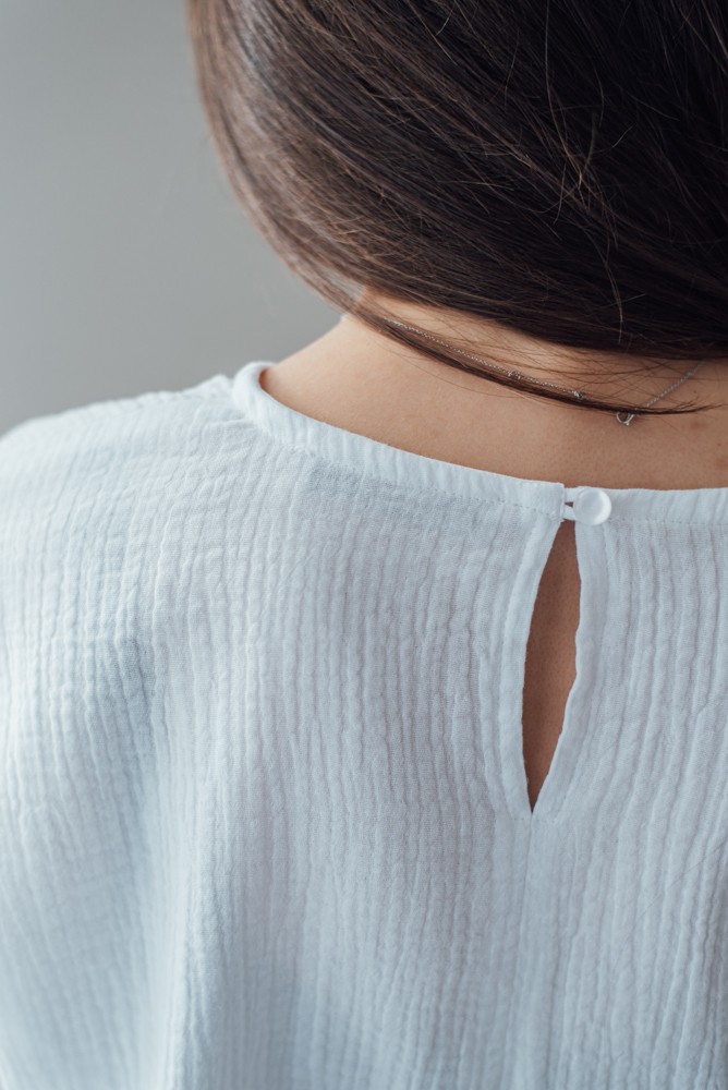 Krásná lehoučká košile z dvojitého mušelínu/gázoviny, což je jemná, lehká, vzdušná tkanina, příjemná na tělo, 100% bavlna. Prodyšná a jednoduchá na údržbu. Má jemně pomačkanou strukturu a nemusí se žehlit.