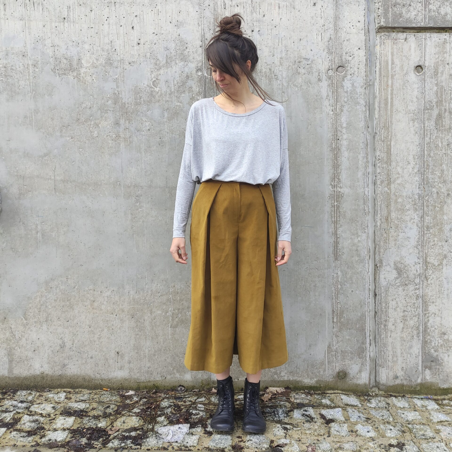 Sukně nebo kalhoty? Jsou to kalhoty širokého střihu, které připomínají sukni. Široké pohodlné nohavice s detailem v přední části a prostornými kapsami schovanými v bočních švech.