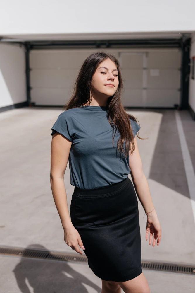 Modrý top z lehoučké viskózy dobře kombinovatelný se sukní, kalhotami nebo třeba pod sako.