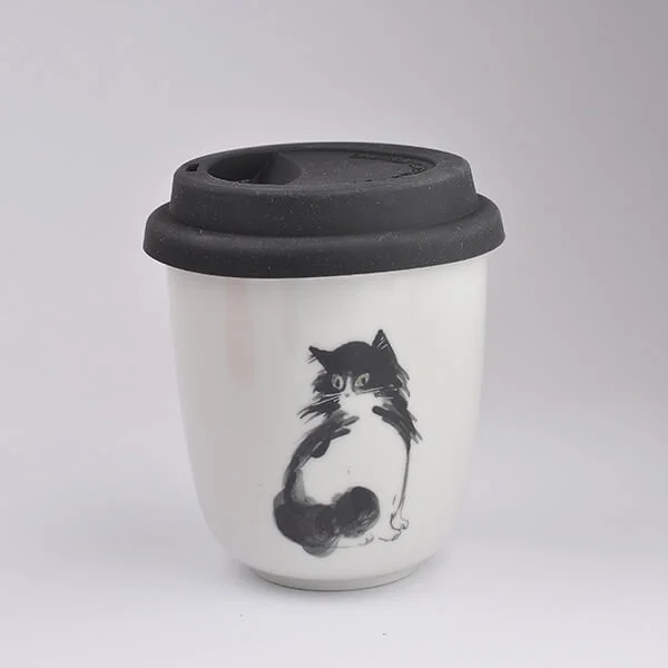Porcelánový pohárek na kafe/čaj s sebou s ruční podglazurovou malbou, bez ucha, se silikonovým víčkem, včetně bavlněného pytlíku.